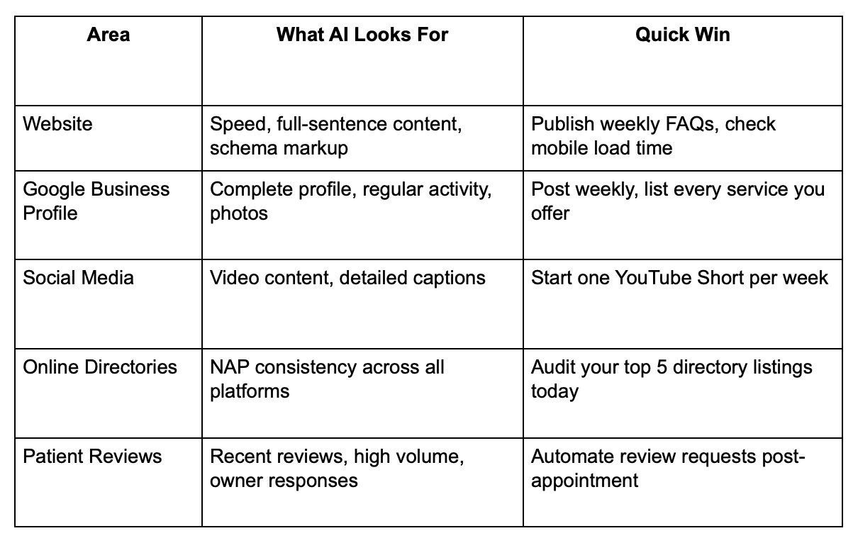Most practices overlook this piece entirely. Making sure your practice has AI-ready content across social platforms is a relatively quick win.